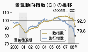 内閣府が6日発表した2008年12月の景気動向指数(CI、05年=100)速報は、景気の現状を示す一致指数が92.3と前月に比べ2.6ポイント低下した。低下は5カ月連続。生産や雇用が軒並み悪化し、指数の下げ幅は昨年8月、11月に次いで過去3番目だった。数カ月先の景気を示す先行指数も3カ月続けて下がり、景気の底入れがいつになるのか不透明感が強まっている。 12月の一致指数は速報段階で使う9つの指標がすべて悪化し、大幅低下につながった。指数の構成指標がすべて悪化する「総崩れ」の状態は10月から3カ月連続。内閣府は基調判断を7カ月続けて「悪化」とした。