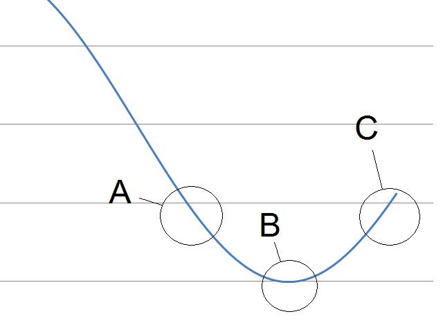 これはカーブしている線が株価の値動き、A,B,Cはそれぞれ売買タイミングです。