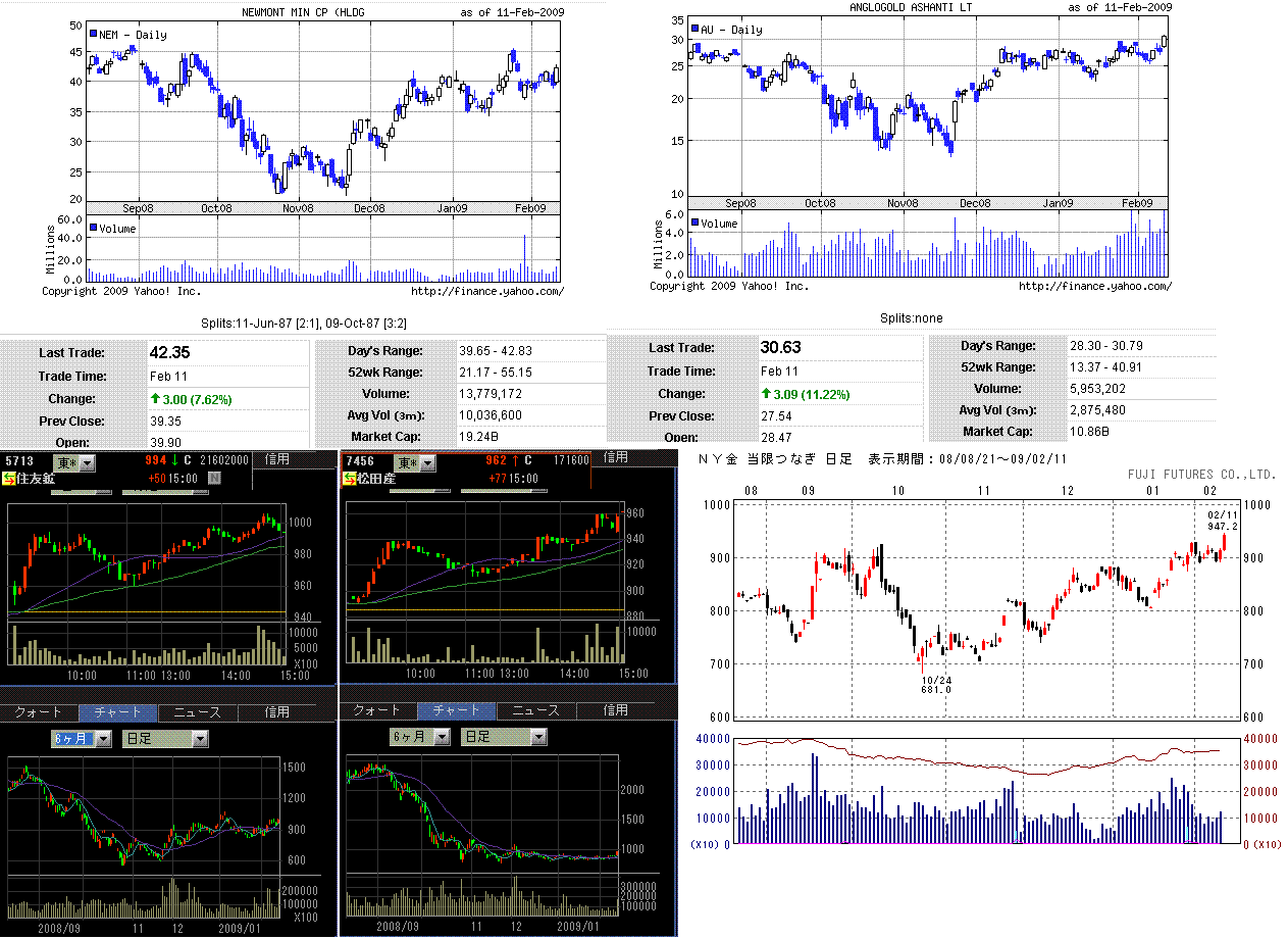 金価格の上昇が理由だと思うのですが、住友金属鉱山、松田産業が強い動きでした。日本株に純粋な金鉱株はないですが、ある程度はゴールドに関わっているということでこの2銘柄は買われているのでしょう。(画像2の上の2つは海外の金鉱株です)