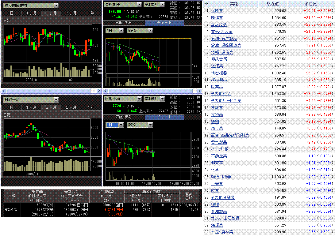 日経平均は下落、TOPIXは続伸。業種別では、原油価格の上昇で資源関連株が上昇、あと陸運、電力、情報通信など内需ディフェンシブ系も買われました。東証一部出来高は少なく、今夜の米国市場が休場なのもあって、やる気の感じられない相場でした。10-12月期GDPの悪さ⇒景気対策で国債増発懸念⇒国債先物売り・株先物買い、により株価が支えられた面もあるようです。