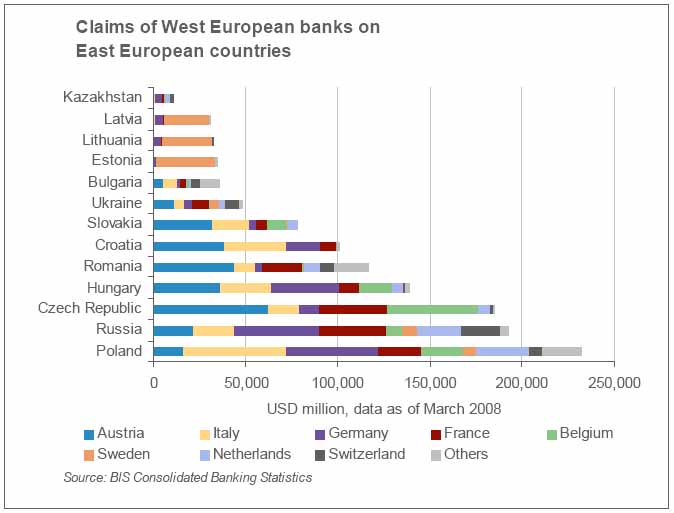 オーストリア、イタリア、ドイツなど西欧諸国の銀行は、新興欧州諸国の銀行を買収して好景気の間に積極的に貸出を行ってきた。その貸出の不良債権化によりそれらの銀行が政府に救済されることになったら、そのコスト結局は西欧諸国の納税者の負担になる。そうしなければ東欧諸国の政府が自分たちの銀行を支えて何とかしようとするだろうが、その場合はIMFの助けを求めることになるがIMFにも余裕は無い。