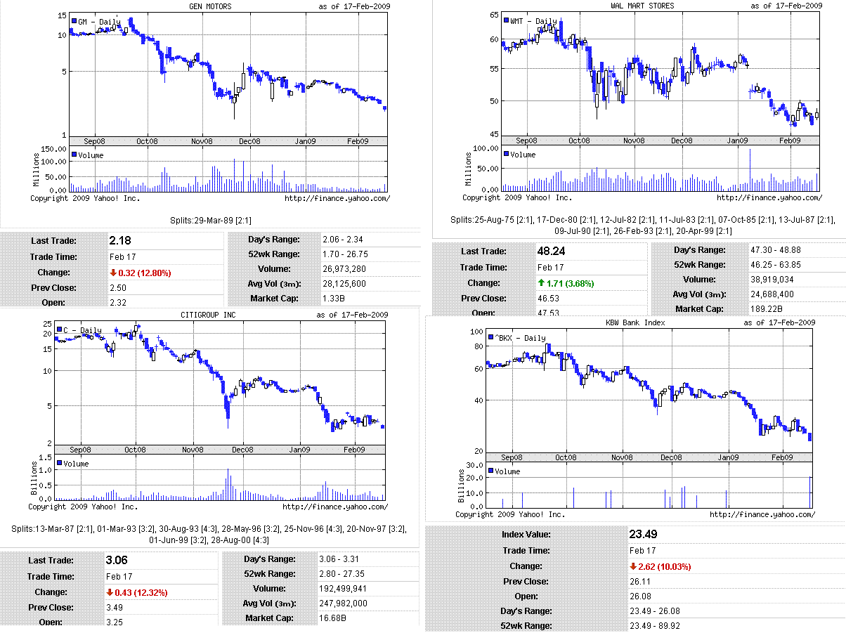 ムーディーズによる欧州新興国と西欧の銀行の財務格付けへの警告から、欧米で金融株が急落。また、再建計画を提出するGM、クライスラーの今後への不透明感もあり、米株は大幅下落となりました。オバマ大統領の署名を経て景気対策法案が成立しましたが材料視されず。なんだか、イベントの度に株式市場は大幅下落していますね。