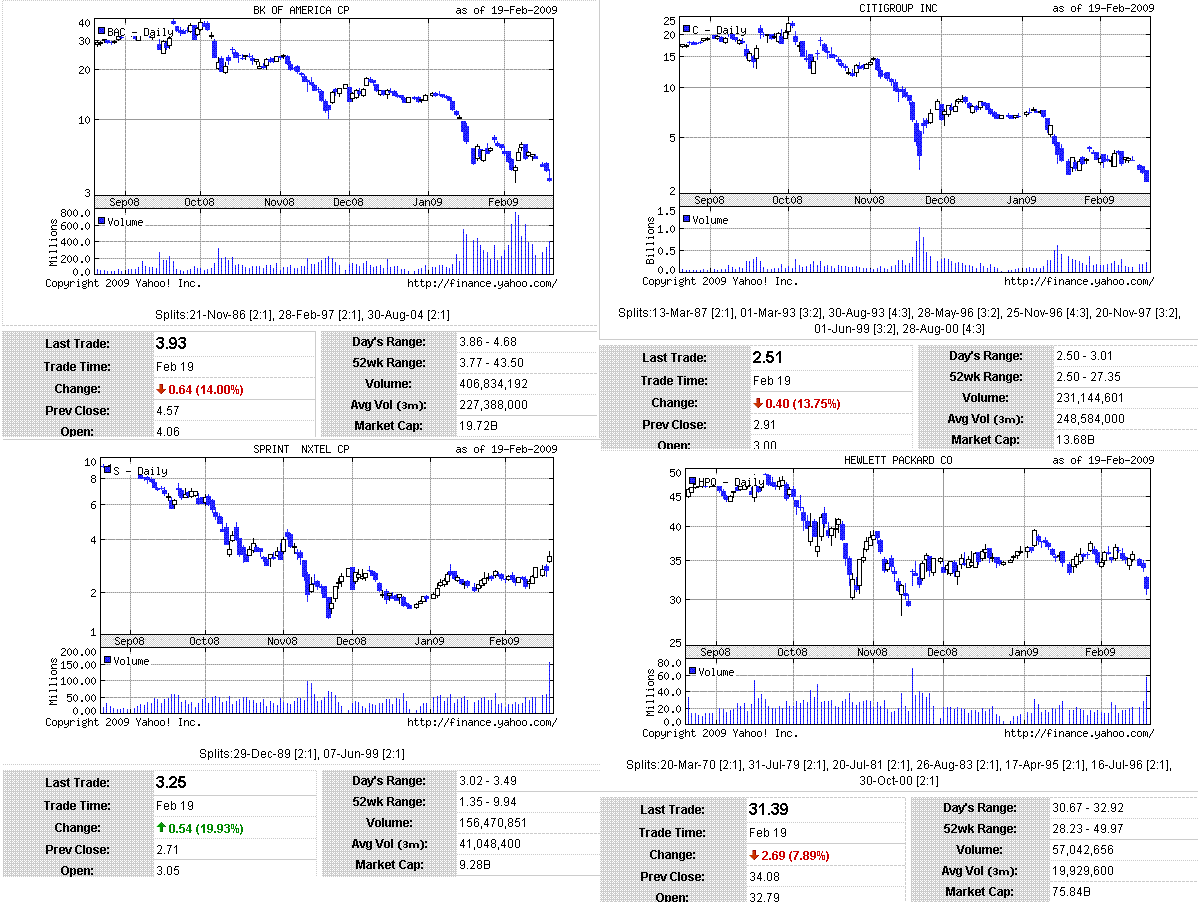 大手行の国有化懸念やHPQの下方修正を嫌気して米株は下落。ダウは、終値ベースで昨年11月の安値を更新(ザラバベースは11/21の7392ドル)。それ以前の安値となると、2002年10月の終値ベース7286ドル、ザラバベース7197ドルになります。S&P500の昨年11月の終値ベースでの安値は752ポイントで、まだ割ってはいません。