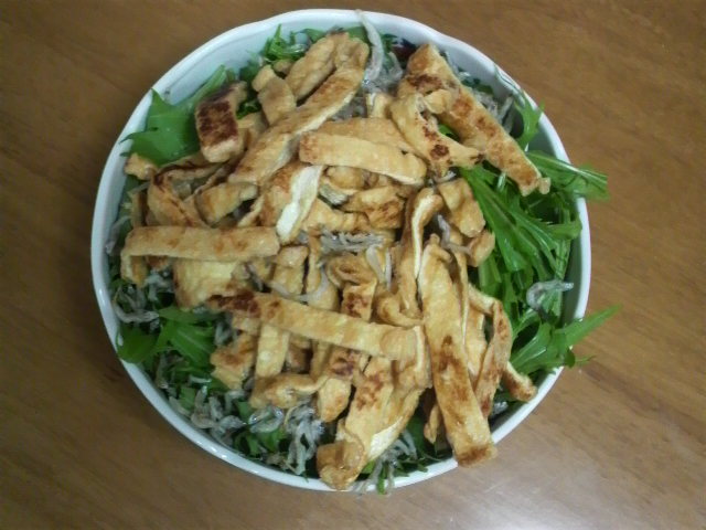 油揚げを細く切りフライパンでカリカリになるまで炒め、同様にじゃこも軽く焦げ目がつくまで炒りまする。炒めた具を切った水菜の上に乗せ、お好みのドレッシングをかけてご賞味あれ。拙者はキユーピーの炒めたまねぎドレッシングを採用しておりまする(^^)