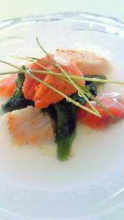 >2皿目はサラダ。ミルフィーユのように、ホタテを使っています。