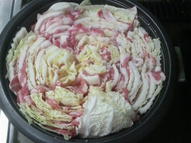 白菜を鍋の高さに合わせて切って敷き詰め、間に豚バラ肉を挟みこみまする。(写真1)味付けは塩少々とお酒と水だけ。お好みでえのきなど加えて、蓋をして煮込んだら(写真2)それで出来上がり(写真3)。あとは豚バラ肉と白菜が勝手に良い味を出してくれるので、拙者のようなズボラな者には大いに助かる一品かと存じまする(^^)