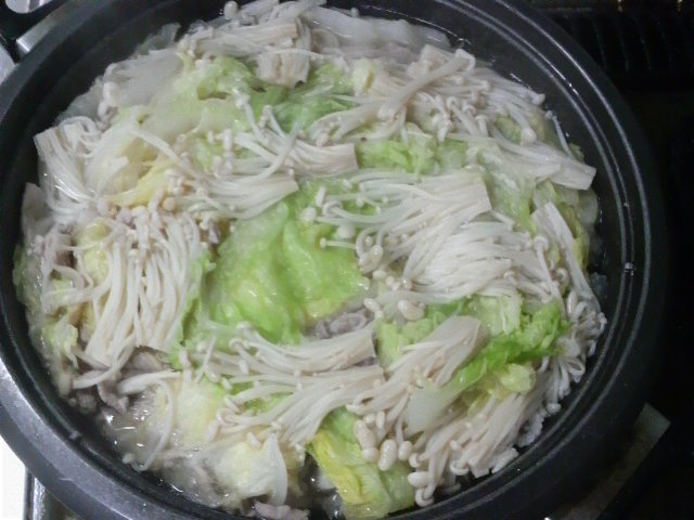 白菜と豚バラを敷き詰めることで、味に対する直接の効果は不明ながら、全体に火は通り易く、ちょうど肉と野菜の味が良くまざるような気が致しまする(^^)