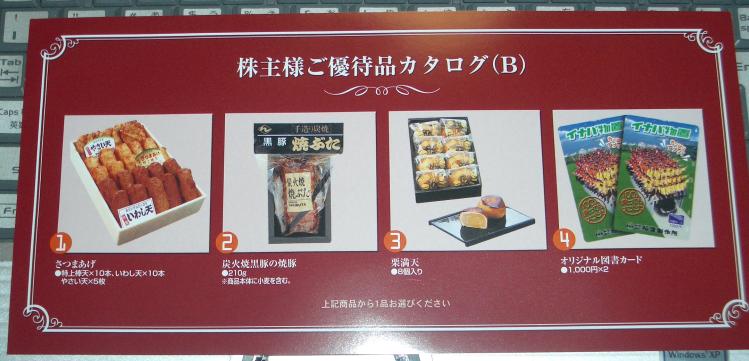 写真は100株株主向けの選択できる商品の一覧でこの中から欲しい物を選んでアンケート葉書を返送すると後日商品が届きます(^^)