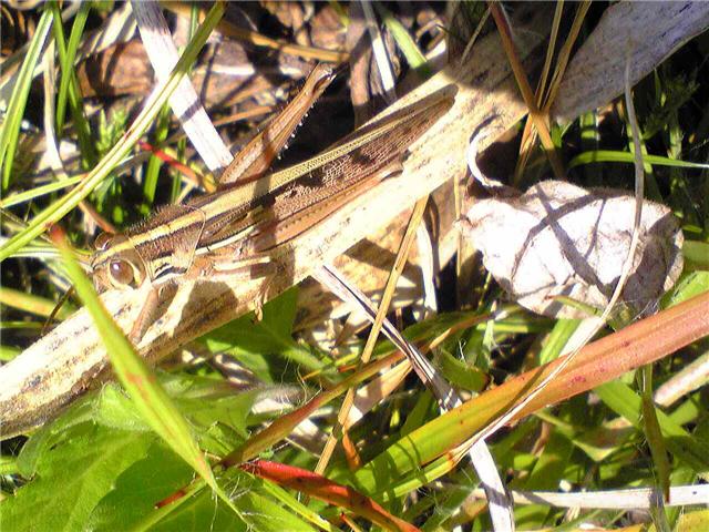 むし、バッタ、幼生:バッタの幼生がいました。まだ何かわかりません。もう一つは親のバッタで冬越しをしたようです。大高緑地は暖かいのでこんなことがあるのでしょう。