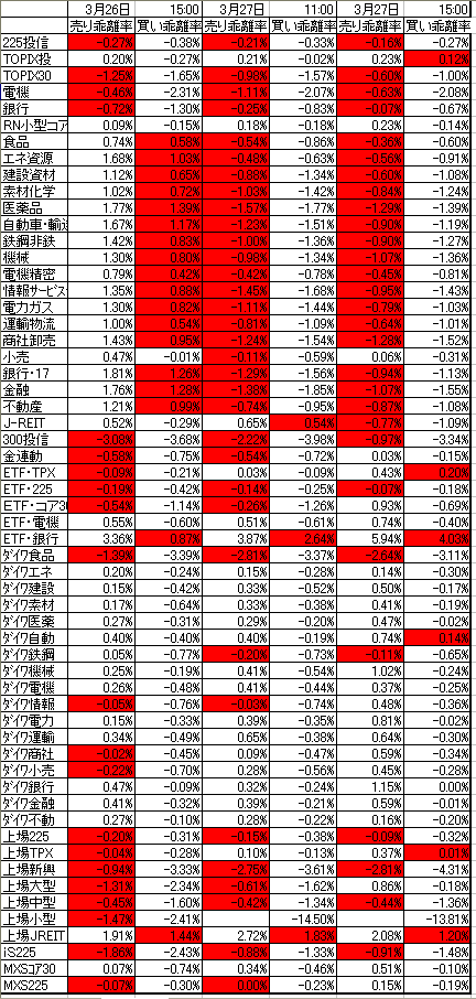 表は、最良売買気配と推定NAVの乖離率です。赤いマスは、割安な売り注文か割高な買い注文があることを表しています。表は、前引けと大引けの状態ですが、ザラ場も同じ傾向です。