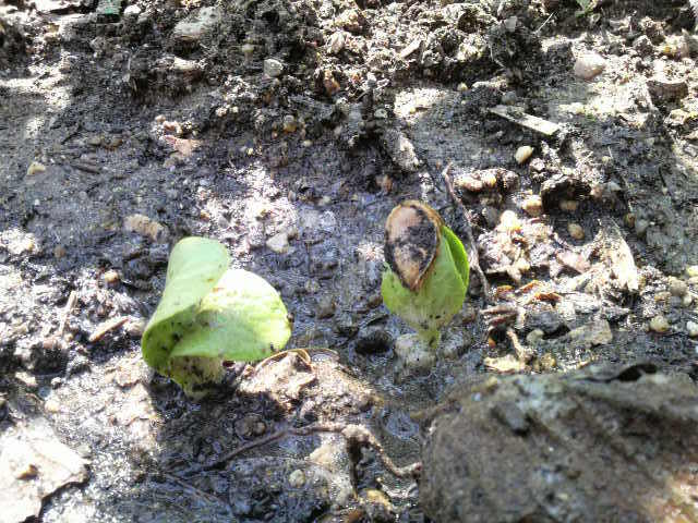 昨日庭を見るとたい肥になりきれなかったカボチャの種からいくつも芽が出てきていました(写真中)。