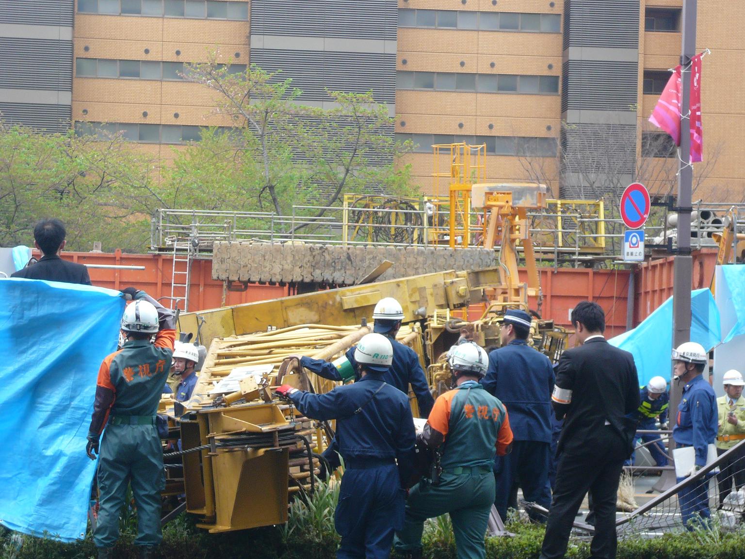 工事現場のボーリングが倒れて靖国通りの片車線をふさいでいます。