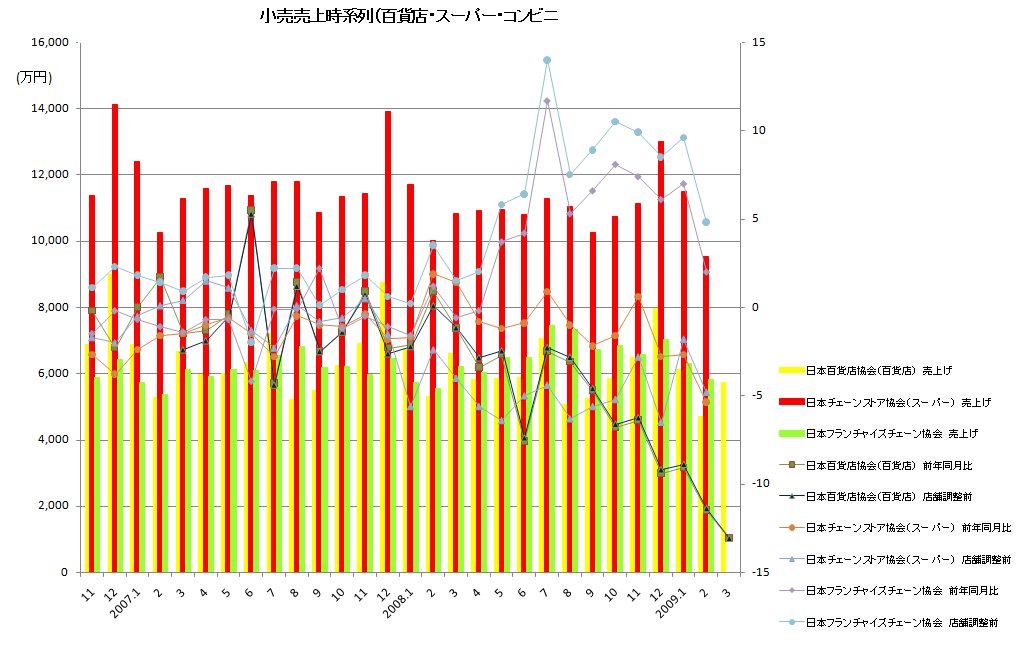 グラフは百貨店のみ3月分を含み、コンビニ、スーパーは2月分までで掲載しています。