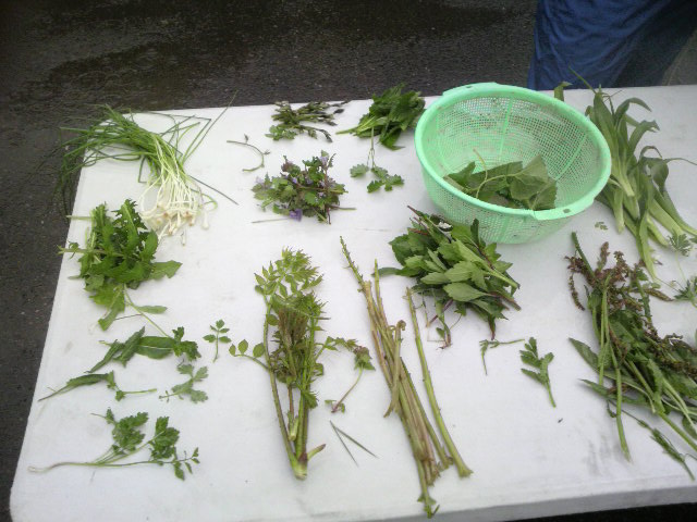 採った成果は、セリ、クレソン、フキ、コゴミ、ゼンマイ、ヨメナ、ヨモギ、ニリンソウ、甘草、ノビル、スイバ、ツクシ、スギナなどなど他にも名前を忘れてしまった野草もいくつかあります。