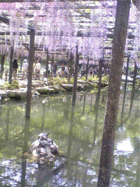 天王川公園の尾張津島藤まつりです。イベントもやっていてすごい人出でした。川の上に落ちてきて花が綺麗にたまっています。カメも花見に来ていました。最近は人間がやかましいなーといっているようです。