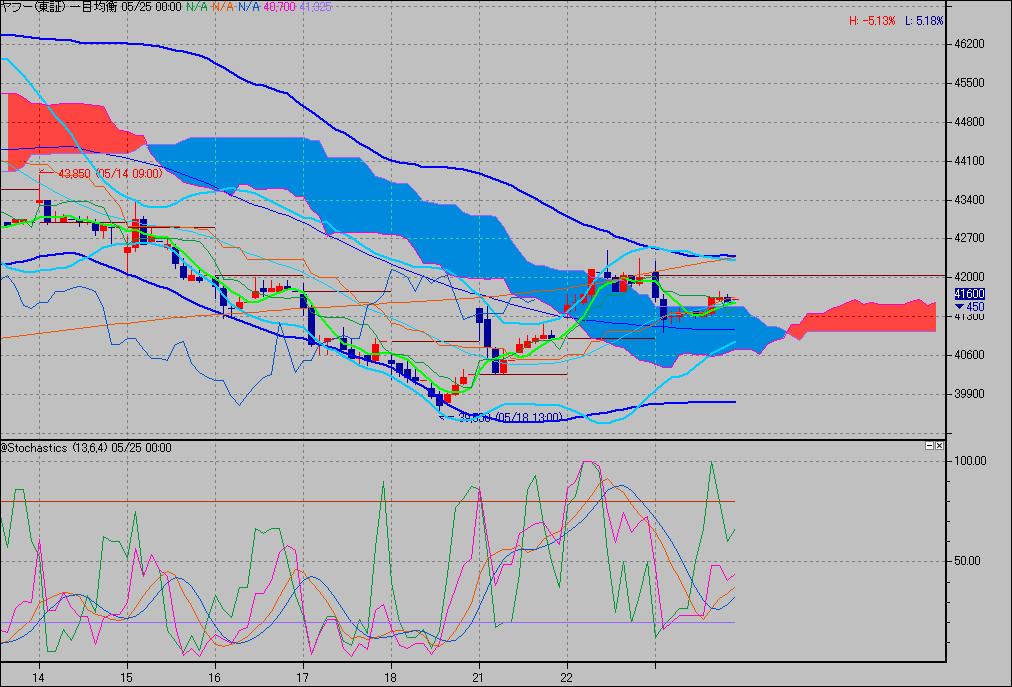 ヤフーをフォローすると、今のところ42,500~41,000のレンジで、案の定、もみ合いに入りました。ここで買ってもしょうがないので、抜けたほうに付くというのが、セオリーでしょうか。
