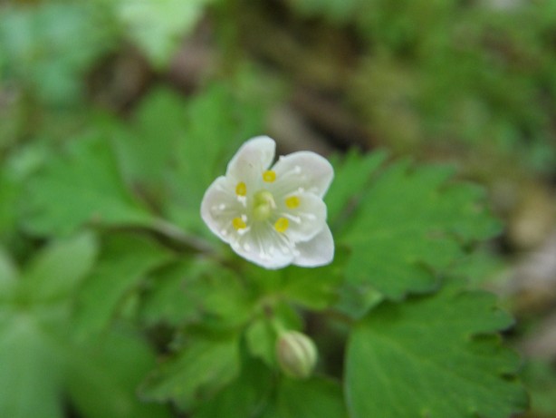 同じきんぽうげ科の良く似た花で「イチリンソウ」がありますが、一箇所の花は1つしか付きませんがニリンソウは一箇所に2つ(写真でも、もう一つ蕾が付いていますね。)付きます。また、イチリンソウの花は一回りも二回りも大きいです。