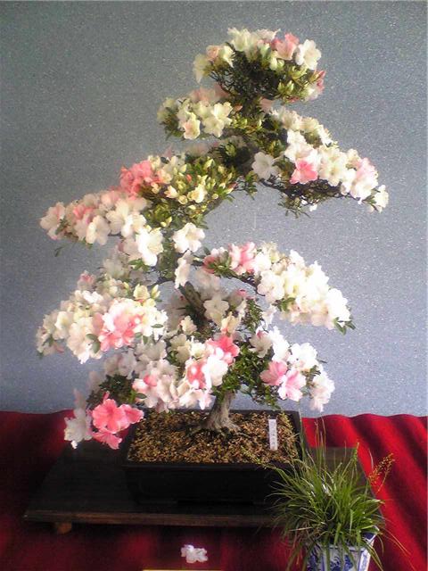 画像の「さつきの盆栽」にも感じられるように、花を置く花台に1つにしても、1本木の丸太を切ってニス掛けしたような台にこだわりを持たせる事や、1つの盆栽から副色の花を咲かせる・・・とゆう方向性が見えてきます。