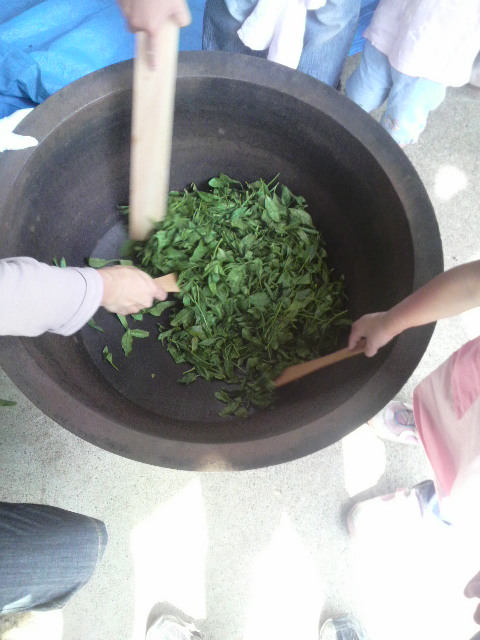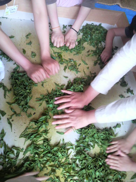 お茶の葉をこげない程度に炒った後、手でお茶をもみます。炒ってすぐにもむので熱かったです。