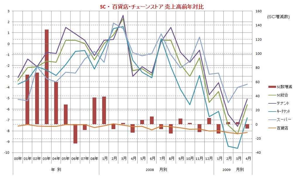 マイナス要素が先行する中、既存SCの前年同月比売上高が、前月比(3月:-8.3%)2.7ポイントの改善を見せたことやマイナストレンドにある移動平均値(年間)が前月比で横ばいであったことなど、若干の好材料も見られた。