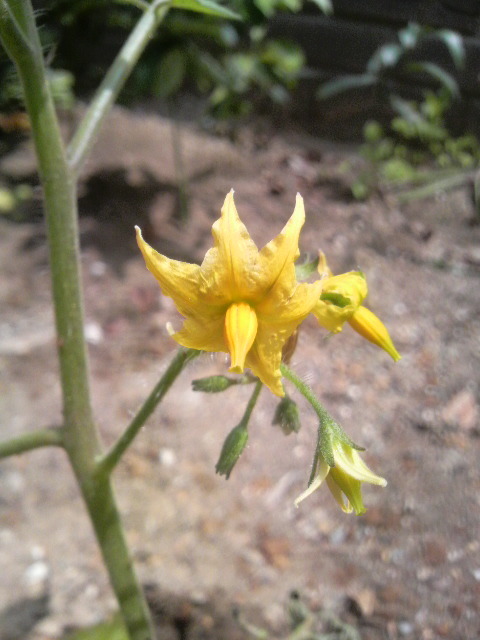 庭の片隅の家庭菜園の野菜に花が咲き始めました。