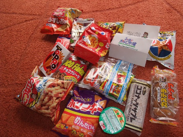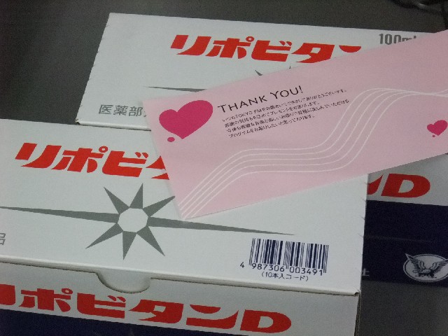 段ボール箱にお菓子いっぱいとリポビタンDが20本が当たりました!