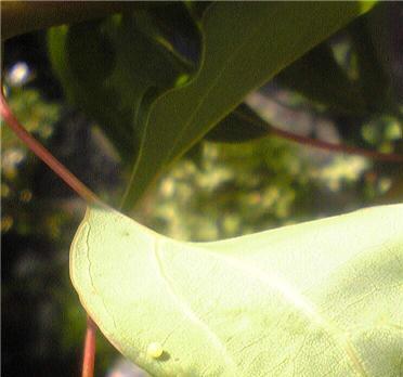 アオスジアゲハの蛹化直前の終礼幼虫です。糸を吐き葉につかまって、もう直ぐ背中が割れそうです。今年は無事にチョウになれそうです。ちょう, アオスジアゲハ, 終齢幼虫: