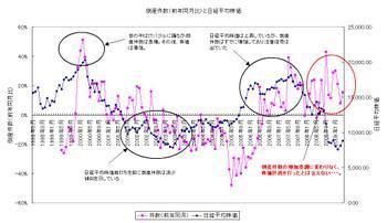 ただし、今回と2003年当時との違いは景気悪化の進行が段違いに早いという点には注意したいところです。今後、政府の中小企業支援策の効果が現れ、倒産件数が対前年で減少に転じれば、株価も底打ちと判断して良いのではないでしょうか。倒産件数、今回に限って遅行指標となっていると願いたいところです。(先行指標であれば、株価は暴落です・・・)