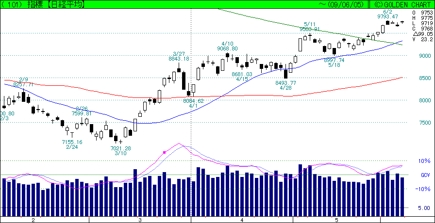 まさしく「押し目待ちに押し目なし」の状態が続いているかと存じまする。ここで52週線を超えれば、いよいよ¥10,000への挑戦。しかも心理的節目以外に抵抗線らしい抵抗線もないので、¥11,000というのも決して夢物語ではないかと…