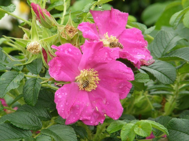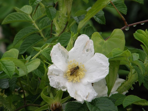 ミツバチでしょうね。不思議なんですよ。ハマナスのところにだけミツバチが沢山寄っているんです。