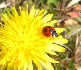 てんとう虫も 輝くお日さまのような お花と 一緒の画像で