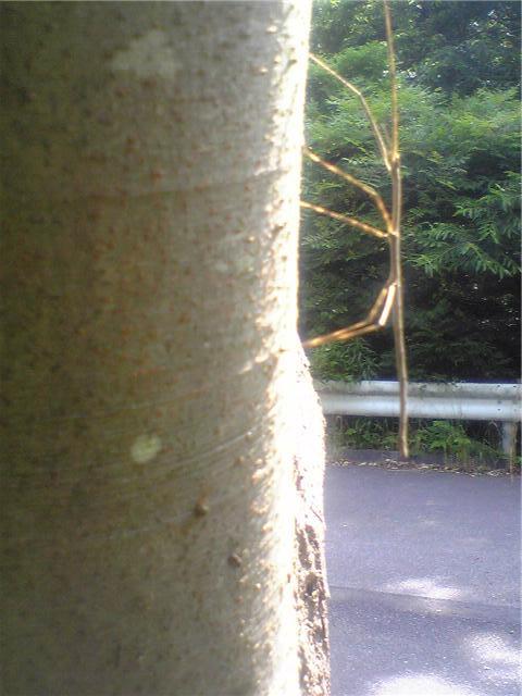 擬態 , ナナフシ , どこにいるかな :同じ木を縦と横から撮影も、2.はどこにいるか全くわかりません。ナナフシの大きな体が木の枝にみえてしまいます。1.でもよく見ないとわかりません。擬態の天才です。
