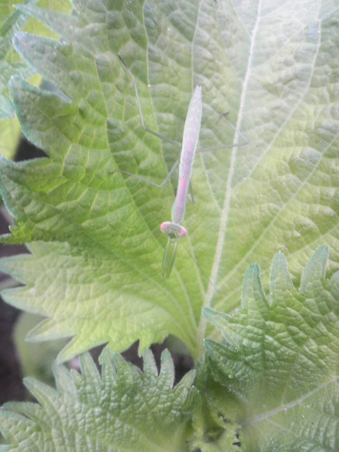 ふと葉っぱを見ると、小さなカマキリがいました。
