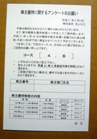 本日(2300)きょくとう の株主優待申込書が到着しました。
