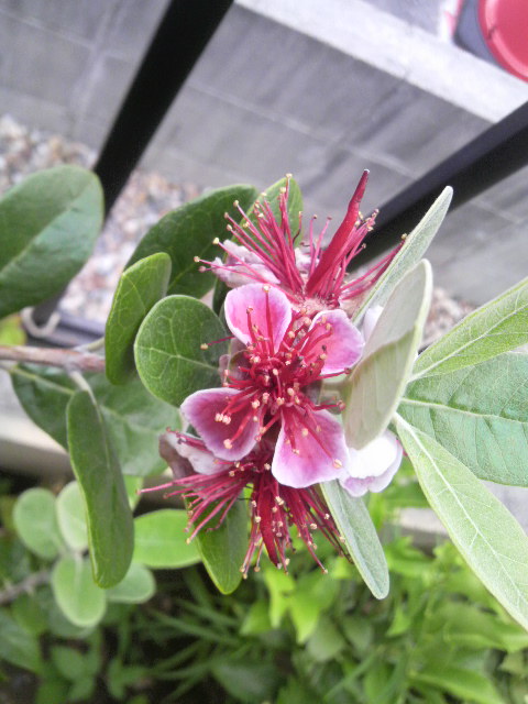 フェイジョアは花も実も葉っぱも楽しめるので気に入っています。