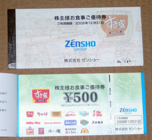 1000株以上 12000円分の食事券 (500円券6枚 4冊)