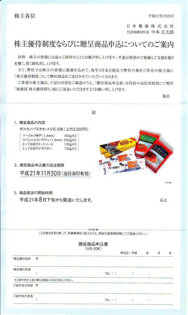日本製麻 株主優待(申込書)到着
