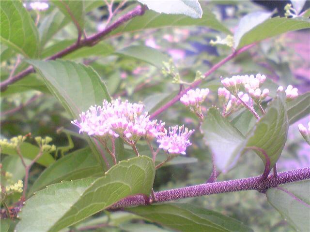 コムラサキ , はな , クチナシ:コムラサキも秋には実のなる木です。クチナシはすごいにおいをさせて咲いています。これも実が成り、天然色素の原料にもなります。