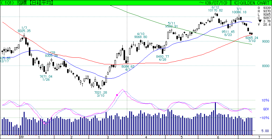 今週はまず週足が陽転、もしくは転換サインがでるかどうか、引き続き様子見の週かと存じまする。¥9,200、¥9,000、200日線、26週線と、果たしてどこで下げ止まるか、まずは下値の確認が肝要でござりましょう。