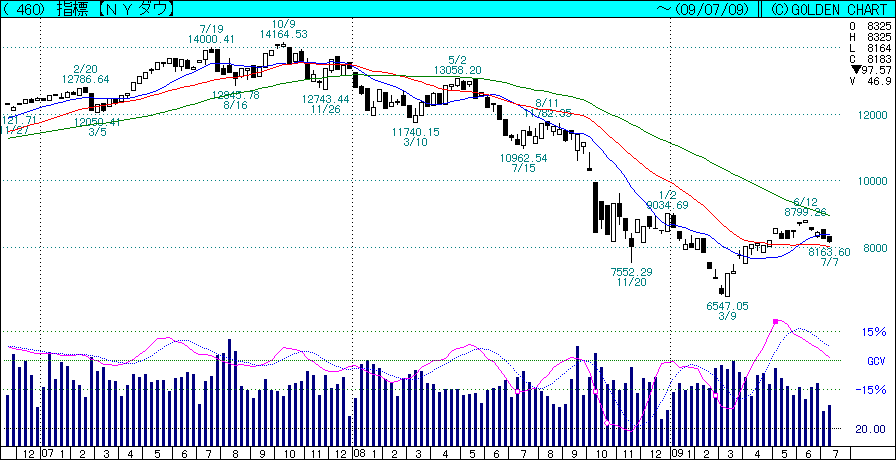 ひとつの目安として、紐育ダウの週足チャート(画像右・青色)も添付しておきまする。ダウが弗7500~8,000で下げ止まって三番底となるのか、それとも弗7,000を割り込んで長期二番底を作りに行くのか、こちらも要注目かと存じまする。