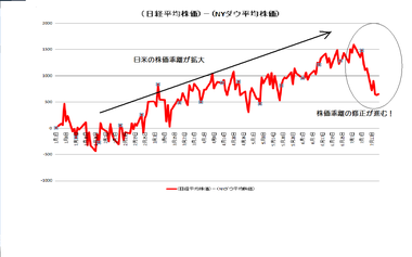 これを、日経平均株価から単純にダウ平均株価を差し引いた乖離幅を示すグラフにしてみると、3月以降の乖離幅拡大が鮮明です。それが、最近2週間ほどで急速に縮小してきています。