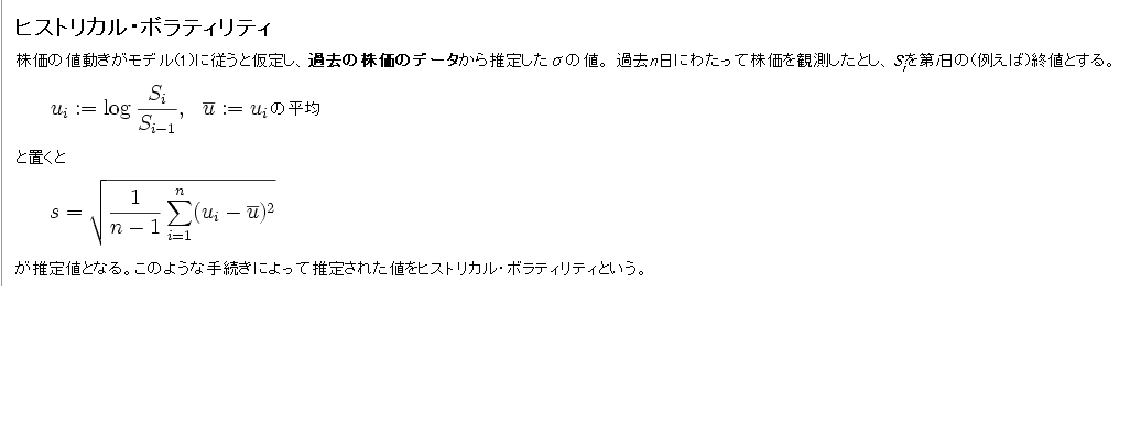 頭が痛くなってきたかもしれませんが、次のヒストリカル・ボラティリティにいきます。計算式は画像3になります。終値を前日終値で割ってその常用対数をリターンとして使い、標準偏差を計算するようです。何故ヒストリカル・ボラティリティで対数を使うのかと言うと、例えば1000円の株価が500円になって、また1000円になった場合、変動幅は同じでも変動率が-50%、+100%と大きく変わってきてしまうためです。ヒストリカル・ボラティリティでは変動率を使うので、この変動率を等価にするために対数を用います。