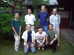 前列ひだりから、南さん、ブライアン君、翔年、後列T氏、tさん、M氏 右の写真は塾の庭にて記念写真