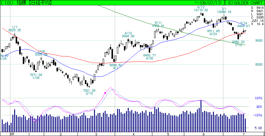 今週の課題として、まずダウが下げずに現在の水準を保てるかどうか。日経は週足が安値圏での差し込み線なので、期待は持てるものの、52週線に頭を押さえられているので、やはり紐育次第でござりましょう。