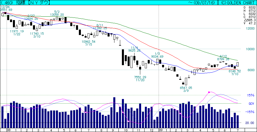 元々ここまで押した原因は、ここ一カ月で弗600以上下げた米国株安だったわけながら、先週はダウの週足(左・青色)も大陽線。一気に6月の高値水準、弗8,700台まで戻してきておりまする。日米ともに株価が迷走を続けているようでいて、案外押し目は買いなのかもしれませぬ。