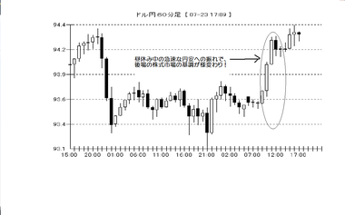 昼休み中に対ドル円レートが突然大きく円安方向に振れました。