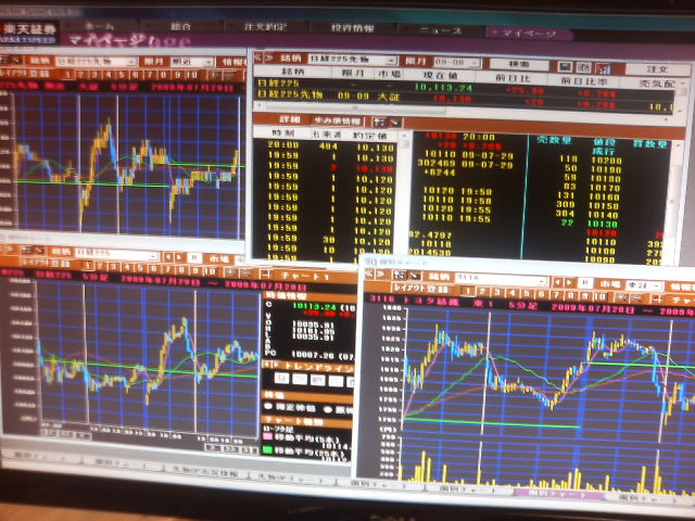 ひとつの画面は先物板歩み値、先物チャート、NK平均、メインの監視チャート