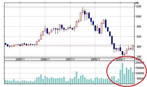 このグラフで見る限り、底値付近から株価と共に出来高が