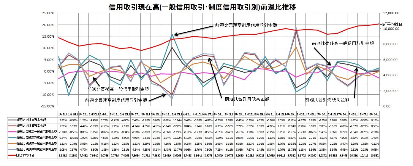 この週(10―14日)の日経平均株価は185円上昇し、週末には1万597円の年初来高値を付けた。相場上昇で個人投資家の投資余力が高まり買い残が増加した。「(環境関連など)一部の材料株へ買いが集中した」(東海東京証券の鈴木誠一マーケットアナリスト)との指摘があった。
