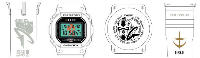 「機動戦士ガンダム」30周年記念商品。ガンダムモデルはG-SHOCKの「DW-5600」がべースで、ベルトと裏ぶたに、ガンダムのイラストと「G」のマークを描いた。バックライトを点灯すると、ホワイトベース所属を意味するペガサスマークが浮かび上がる。